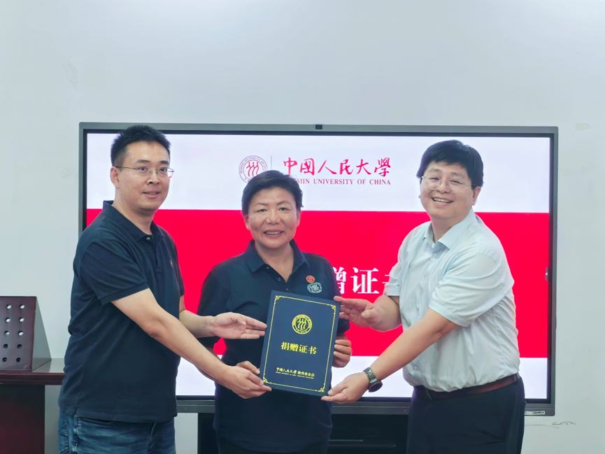 柴云鹏、郭栋向1991级校友代表崔莉霞颁发捐赠证书