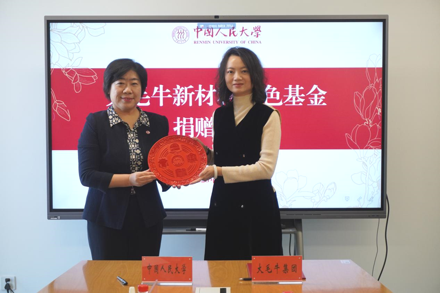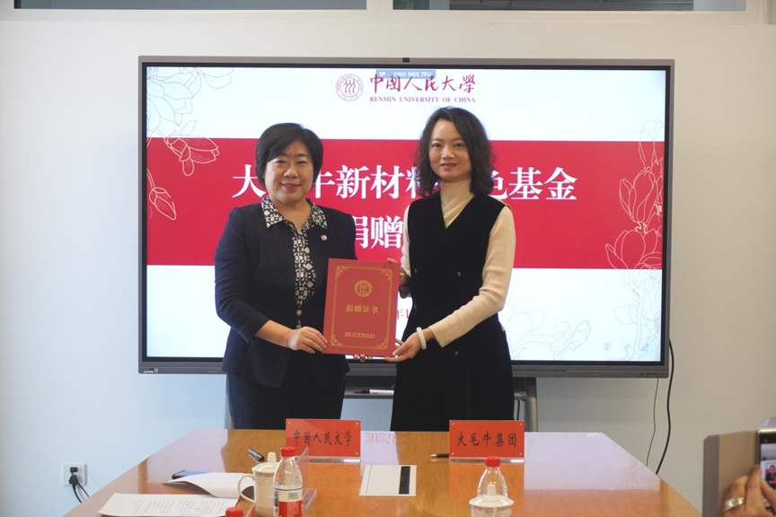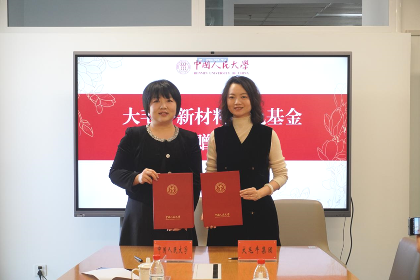 12月6日,江苏大毛牛新材料有限公司捐赠仪式在交叉科学研究院1605会议室举行。江苏大毛牛新材料有限公司董事长白朋,总经理张媛婷,股东程军杰,中国人民大学党委副书记、副校长王易,校友服务与资源拓展部部长、教育基金会秘书长、校友会秘书长赵潇,科学技术发展部部长、化学与生命资源学院院长王亚培,交叉科学研究院副院长、国家治理大数据和人工智能创新平台主任龚新奇及学校校部机关相关同志共同出席。
