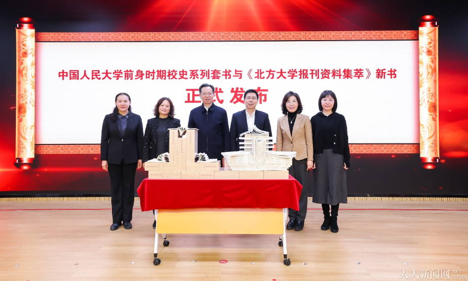 会上,郑水泉,中国人民大学校史馆、博物馆馆长李贞实,中国人民大学出版社副总编辑于波,贾云霄,徐惠敏,张盈利共同发布中国人民大学前身时期校史系列套书和《人民立场 求是精神——北方大学报刊资料集萃》。