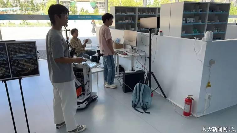 在“冰丝带”赛场中央,医药场景的药品拆装比赛正在进行,RUC-HuHa战队成员戴着VR设备,远程操纵机器人进行药品抓取,一旁负责提供技术支持和指导的团队成员紧张地叮嘱着:“稳住!注意角度和方向。”五六米之外,一台轮式双臂机器人正在团队的遥控下缓缓移动,对药品进行拆分和装盒。