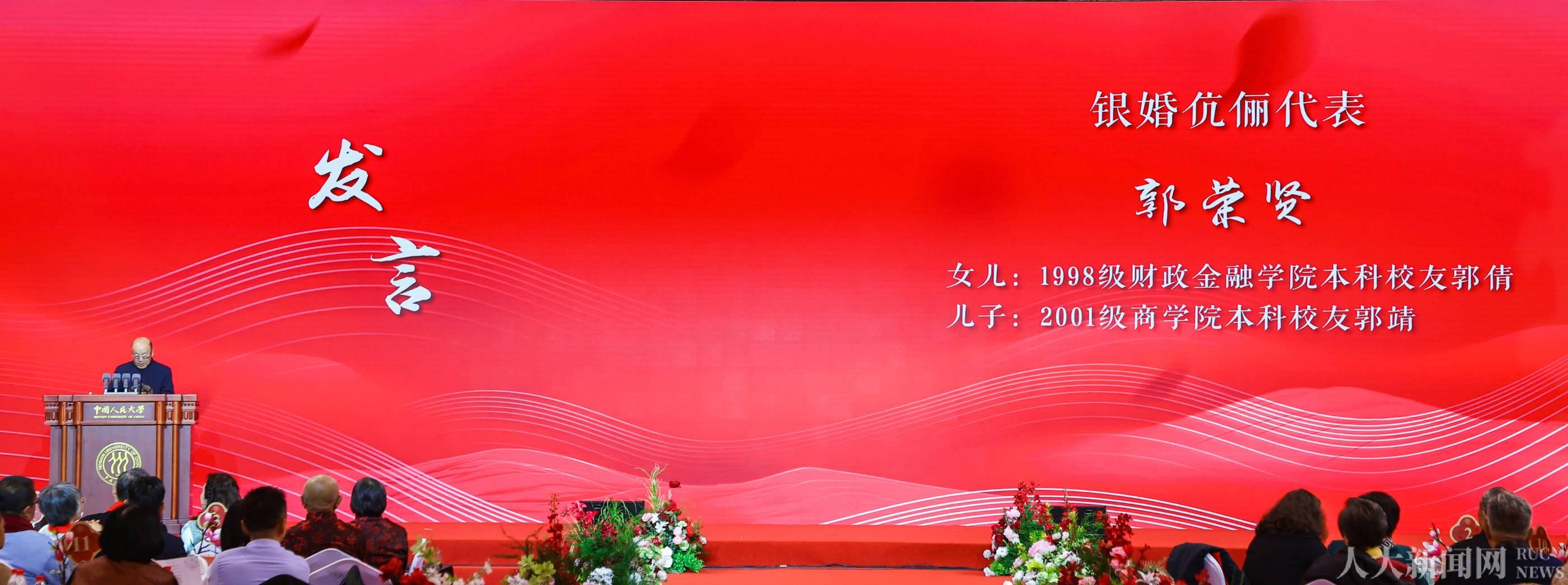 在现场,1998级财政金融学院本科校友郭倩和2001级商学院本科校友郭靖的父亲郭荣贤作为银婚伉俪代表分享了他在事业、家庭与人大情缘中的感悟,诠释了携手闯岁月的坚定。