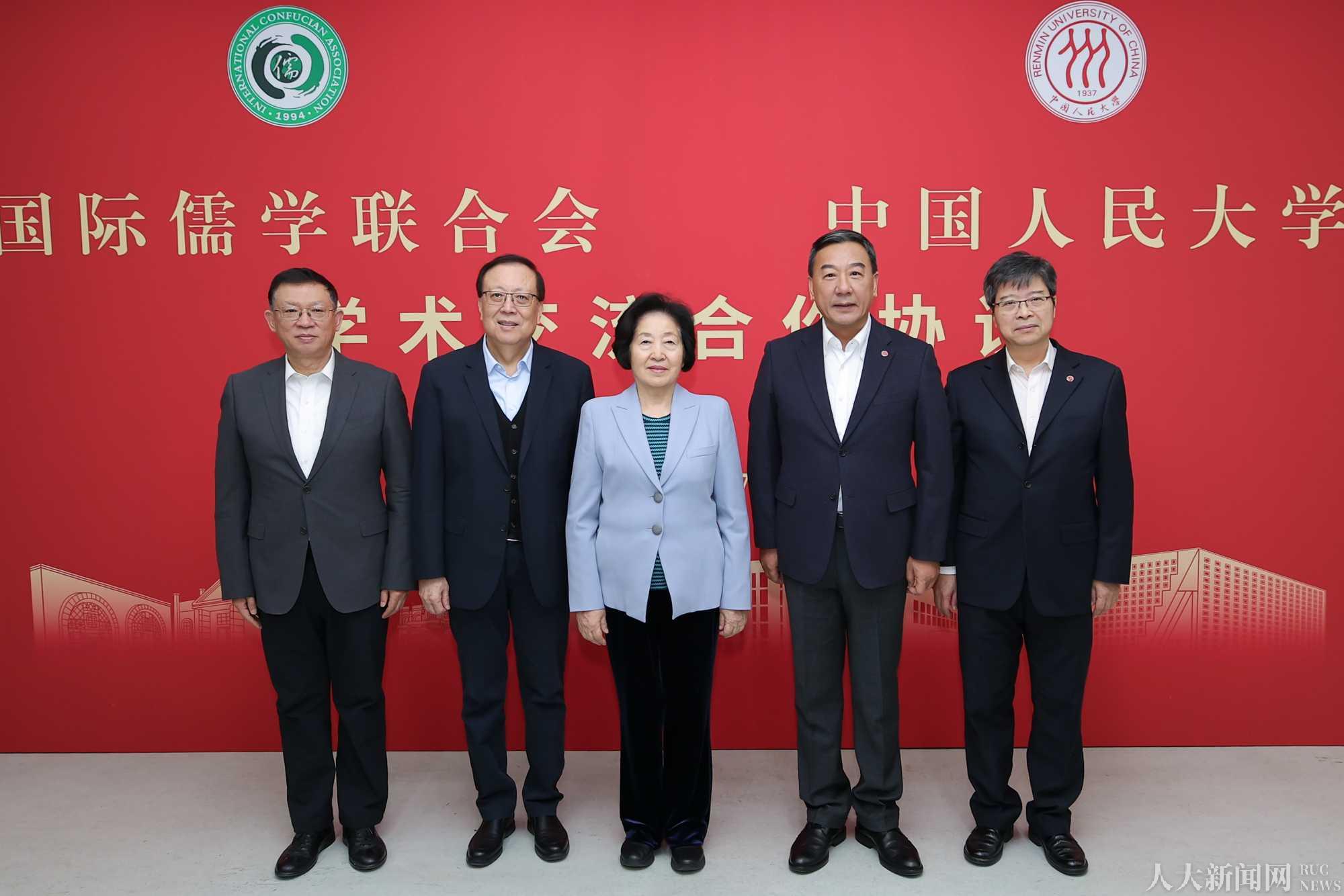 在国际儒学联合会会长孙春兰、国际儒学联合会常务副会长郝平、中国人民大学党委书记张东刚的共同见证下,中国人民大学校长林尚立、国际儒学联合会秘书长马箭飞代表双方签署学术交流合作协议。