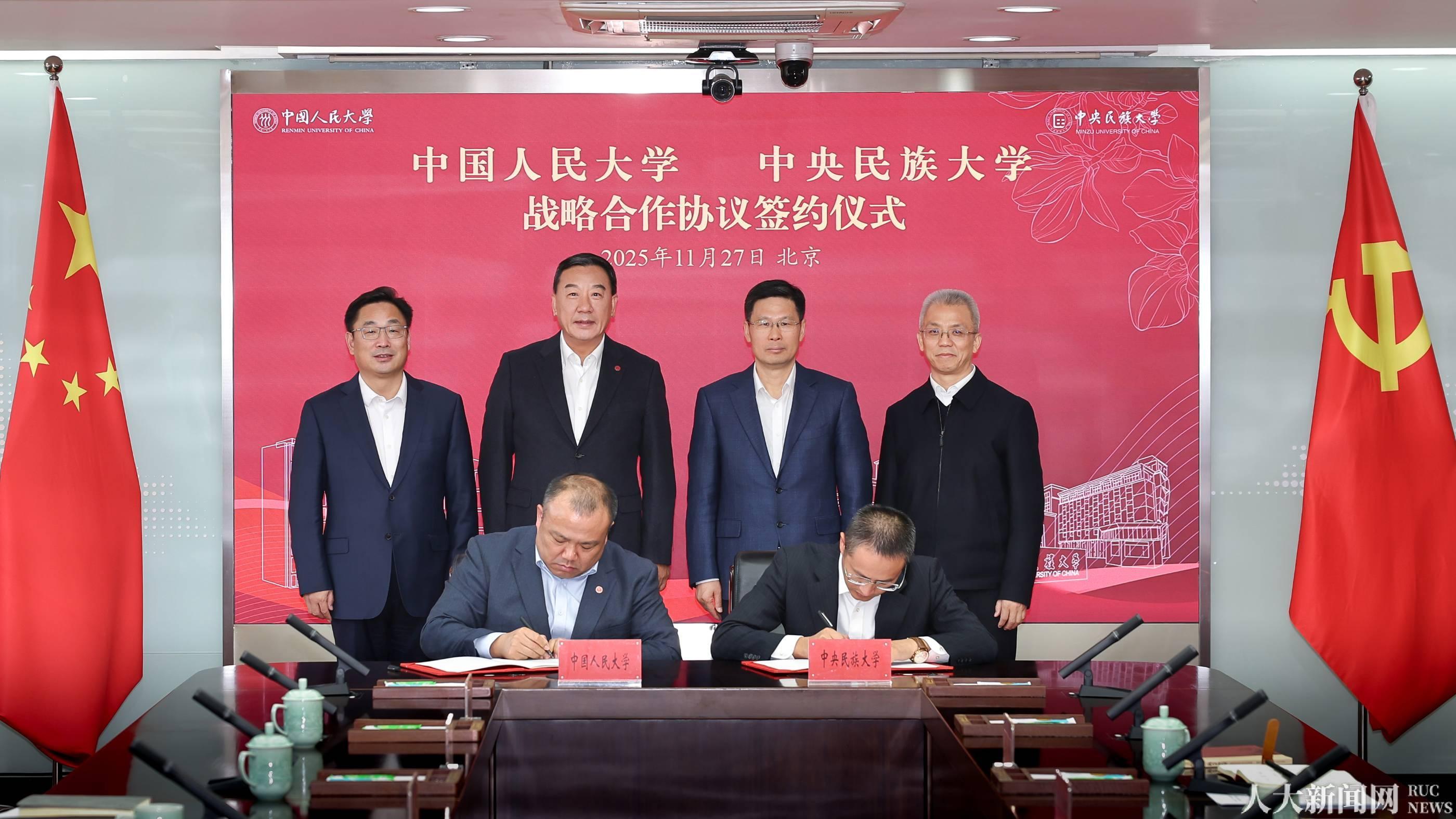 传承红色基因、携手共创未来,11月27日,中国人民大学与中央民族大学签署战略合作协议,加快建构中国自主的知识体系,共同服务推进中华民族共同体建设,开启双方事业合作发展新篇章。