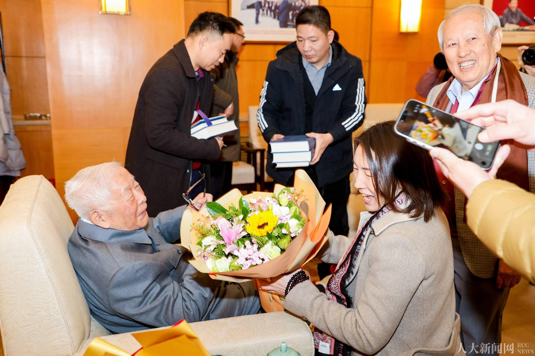 中国人民大学新闻学院青年教师代表为方汉奇先生赠送鲜花。