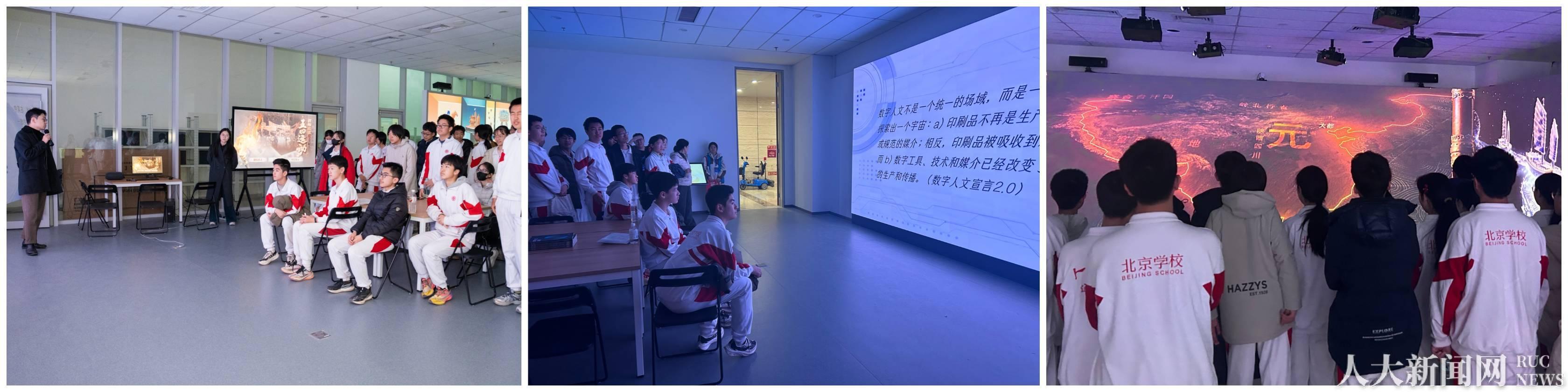 数字人文研究院立足数字技术赋能人文研究,带来了一堂生动的数字人文通识科普课,现场展示了“北京记忆”“四维北京”“京城大运河互动光影展”等代表性成果,让同学们体会到人文研究成果的“触手可及”和“双向对话”;在沉浸式体验环节,同学们被交互装置的直观与趣味所吸引,积极上手操作,深刻感受到数字与人文交叉融合的独特魅力。